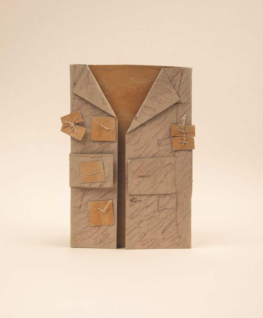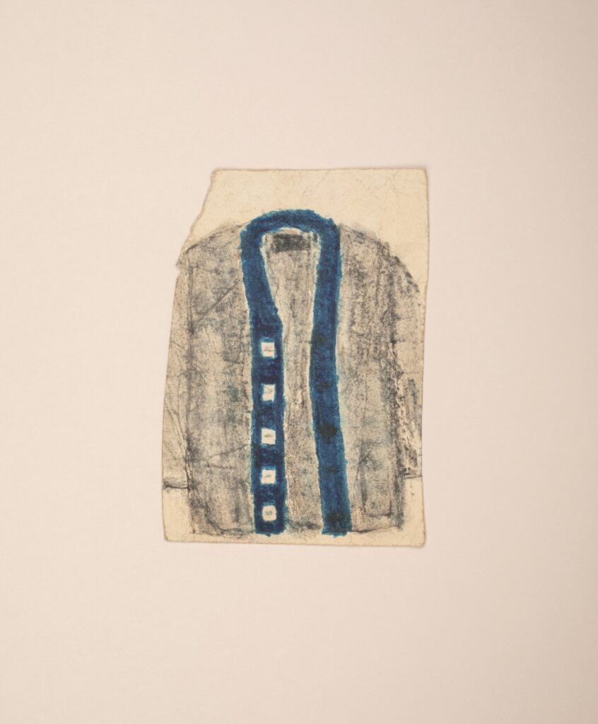 James Castle’s coat works—made from folded, sewn, and drawn paper—reveal a singular artistic universe built from repetition, restraint, and material ingenuity. Neither purely objects nor images, the coats hover between abstraction and recognition, asserting presence through subtle variation in form, stitch, and surface. Using humble, repurposed materials, Castle returns to the coat as a structure of being rather than clothing, testing how minimal means can generate complexity. What emerges is not stylistic evolution but sustained attentiveness: a coherent, enduring inquiry into form, material, and perception.